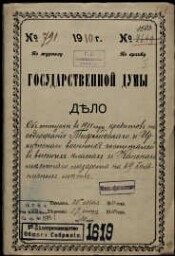 Государственная дума I, II, III и IV созывов. Фонд Государственная Дума I, II, III и IV созывов. Дело по законопроекту Военного министерства, внесенному в Государственную думу Третьего созыва, об отпуске средств на покрытие расходов, вызванных оставлением Тифлисского и Иркутского военных госпиталей в высших классах и увеличением больничных мест в Канском лазарете военного ведомства