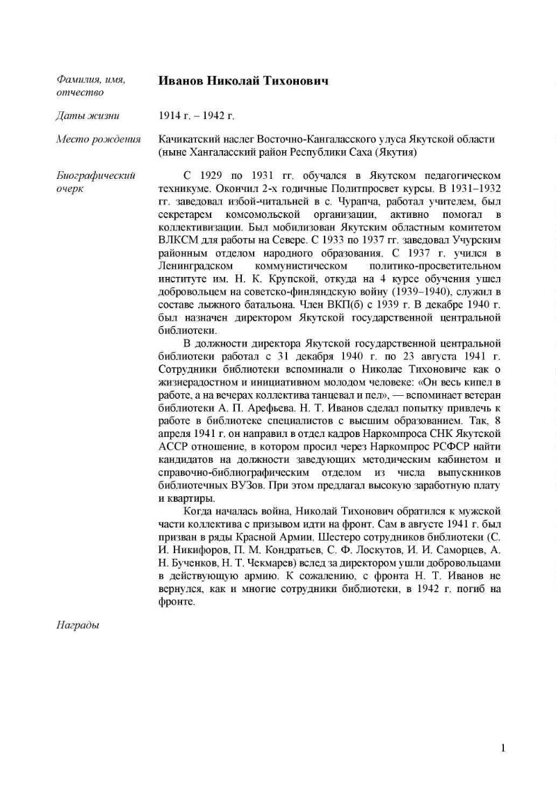Иванов Николай Тихонович (1914-1942). Биография. Якутск, 2025.