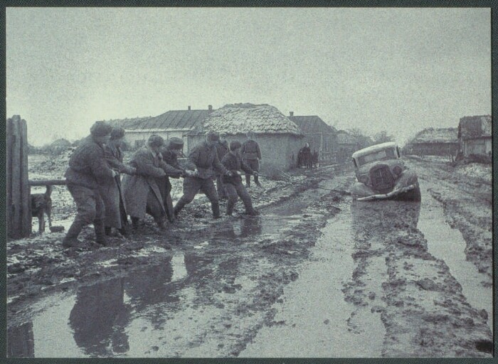 Бойцы вытаскивают машину. Фото А. Устинова. 1945.